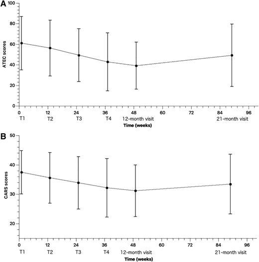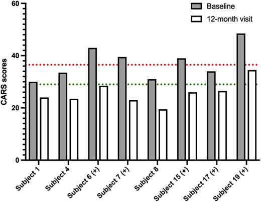 在基線和12個月訪問期間,八名參與者的兒童自閉癥評定量表 (CARS) 分數有所改善。