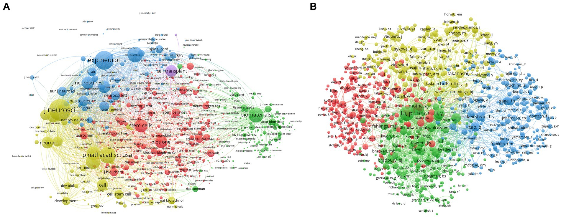 (B)1,000位作者對(duì)脊髓損傷研究干細(xì)胞療法的共被引分析的映射。點(diǎn)的大小代表兩個(gè)期刊/作者已經(jīng)建立了合作。線條越粗,兩個(gè)期刊/作者之間的聯(lián)系越緊密。