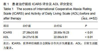 除1例共濟(jì)失調(diào)患者治療無效外,其余患者均有效,表現(xiàn)為行走和站立不穩(wěn)、運(yùn)動(dòng)遲緩、上肢精細(xì)動(dòng)作障礙、書寫困難、構(gòu)音障礙等臨床癥狀得到改善。