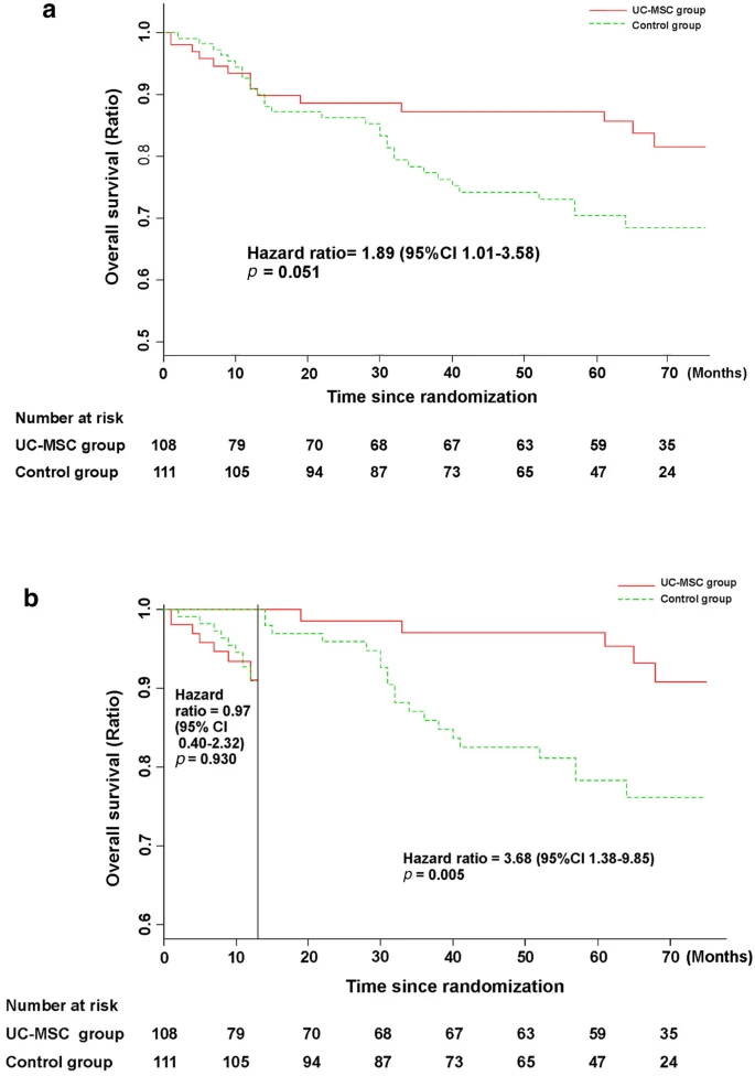 • 在75個月的隨訪中,UC-MSC治療組與對照組之間的總生存率無顯著差異。(圖a)