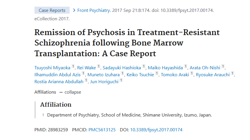 Miyaoka T, Wake R, Hashioka S, Hayashida M, Oh-Nishi A, Azis IA, Izuhara M, Tsuchie K, Araki T, Arauchi R, Abdullah RA, Horiguchi J. Remission of Psychosis in Treatment-Resistant Schizophrenia following Bone Marrow Transplantation: A Case Report. Front Psychiatry. 2017 Sep 21;8:174. doi: 10.3389/fpsyt.2017.00174. PMID: 28983259; PMCID: PMC5613125.