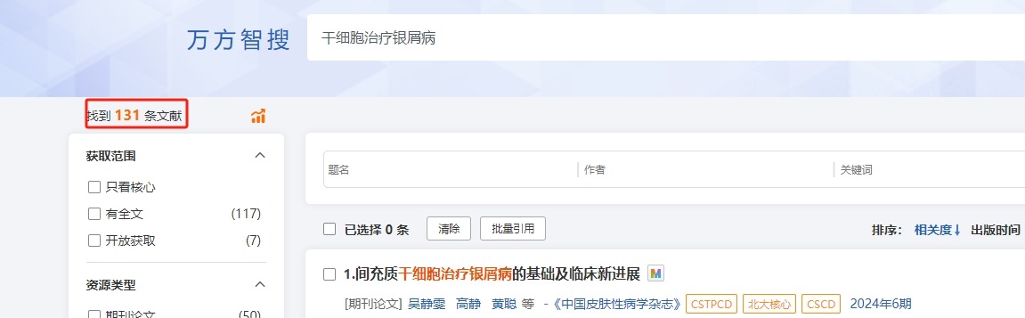 截止2024年10月29日,國內萬方數據wanfangdata網站上搜索關于干細胞治療銀屑病的相關文章研究成果有131條。