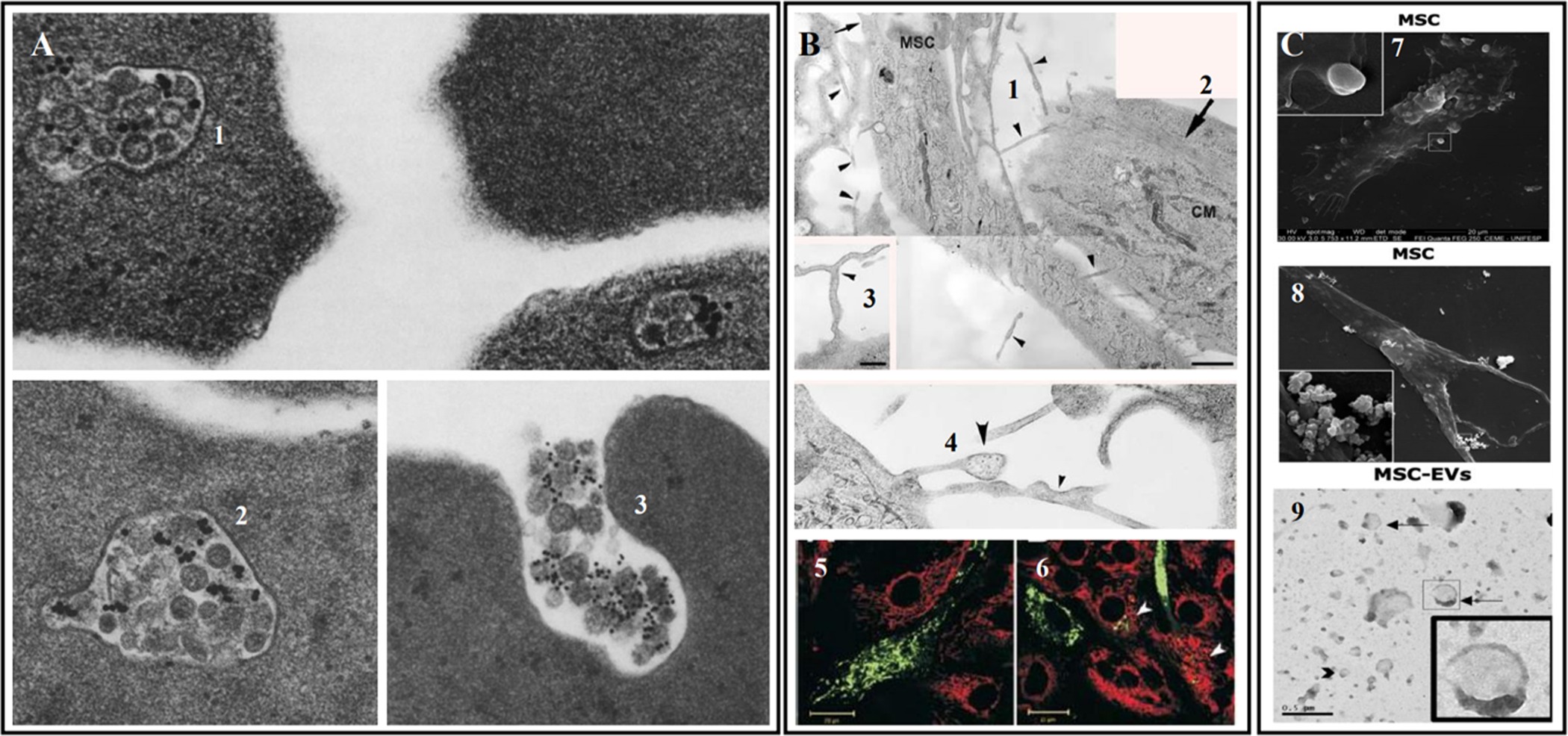 盡管早期有證據表明MSC直接分化和細胞替換,但最近的研究強烈表明,它們最重要的作用機制可歸因于它們能夠分泌旁分泌因子,包括細胞外囊泡 (EV) 和細胞因子,將線粒體轉移到附近的細胞 (圖2)、遷移并改變免疫反應(免疫調節)。