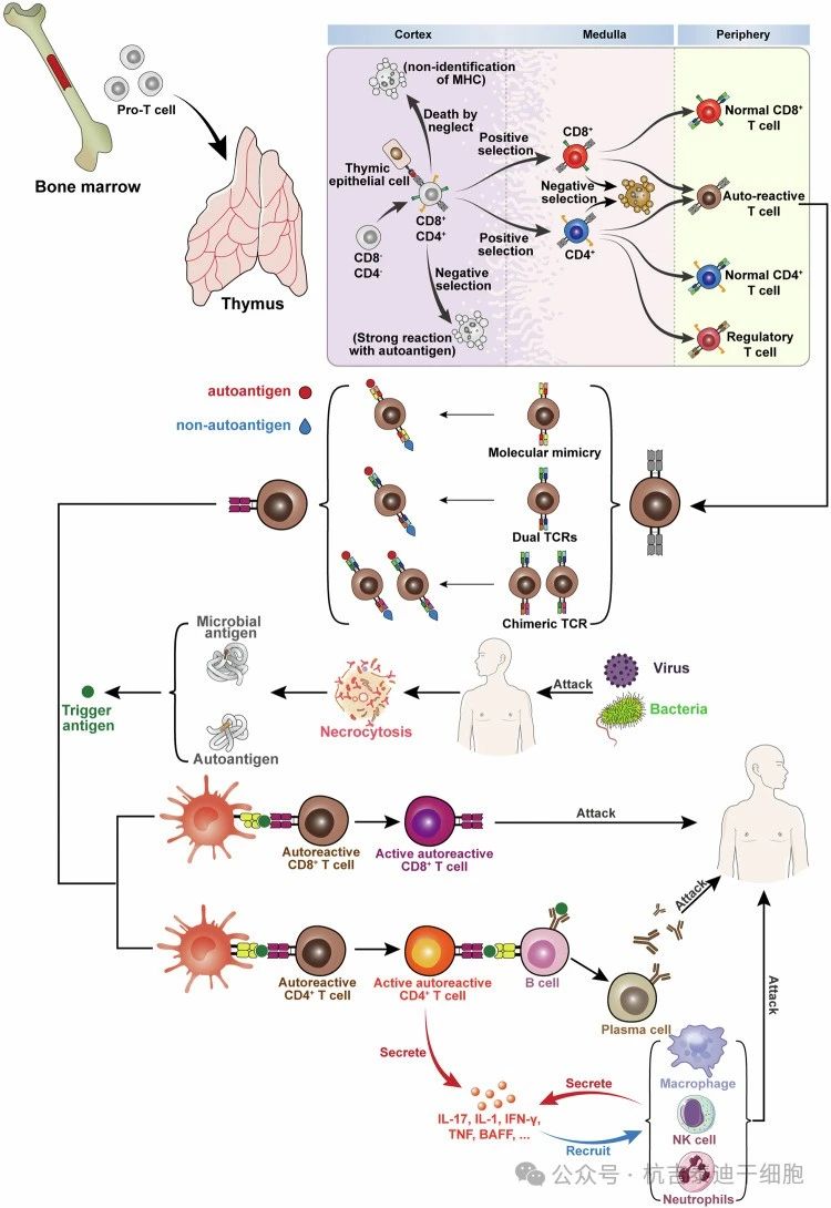 免疫調節異常:自身免疫性疾病的特點是免疫紊亂導致自身活性免疫細胞異常激活,從而造成組織損傷。其中免疫系統中的調節性T細胞(Tregs)起著重要的免疫抑制作用。眾所周知,T細胞在進入外周發揮免疫功能之前,會在胸腺中經歷正向和負向選擇。胸腺中自反應T細胞的負選擇是中樞免疫耐受的主要機制(圖1)。