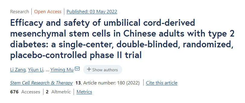 此外,解放軍總醫(yī)院內(nèi)分泌科母義明教授、生物治療中心韓衛(wèi)東教授等人也在Stem Cell Res Ther期刊上發(fā)表了一項(xiàng)單中心、隨機(jī)、雙盲、安慰劑對(duì)照試驗(yàn)的結(jié)果,考察了臍帶間充質(zhì)干細(xì)胞治療2型糖尿病的有效性和安全性。
