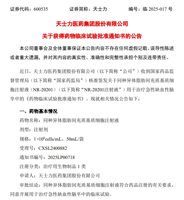 該藥物由天士力醫(yī)藥集團(tuán)自主研發(fā),擬用于治療急性缺血性腦卒中。此次批準(zhǔn)標(biāo)志著中國在細(xì)胞治療領(lǐng)域?qū)崿F(xiàn)重大突破,成為全球少數(shù)完成此類藥物監(jiān)管審評的國家之一。