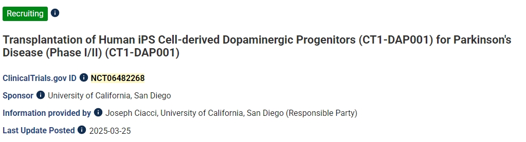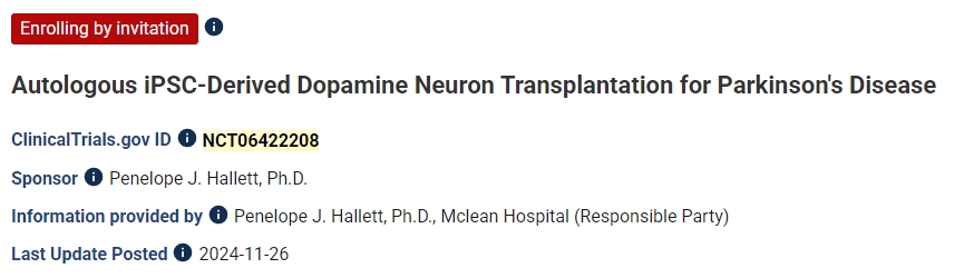 2.自體iPSC多巴胺神經(jīng)元移植試驗(yàn)(NCT06422208)