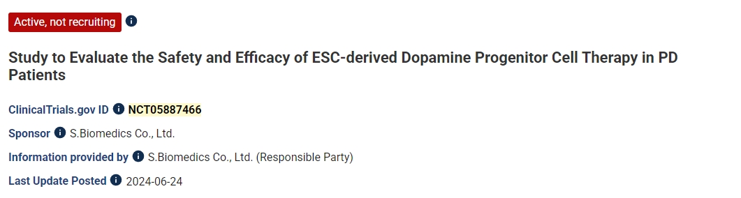 該項(xiàng)臨床試驗(yàn)(NCT05887466)是一項(xiàng)開(kāi)放標(biāo)簽、單中心、單劑量、劑量遞增、I/IIa期試驗(yàn),旨在評(píng)估胚胎干細(xì)胞衍生的A9多巴胺祖細(xì)胞(A9-DPC)治療PD患者的安全性和探索性療效,該試驗(yàn)由S.Biomedics贊助。這項(xiàng)研究基于Dong-Wook實(shí)驗(yàn)室進(jìn)行的臨床前工作。