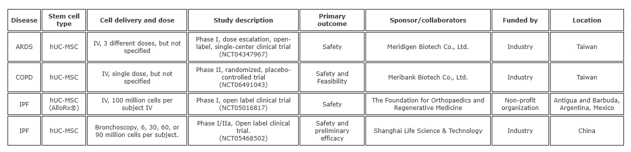 表1:ClinicalTrials.gov上列出的正在進行和當前正在招募的研究,研究使用MSCs治療肺部疾病。