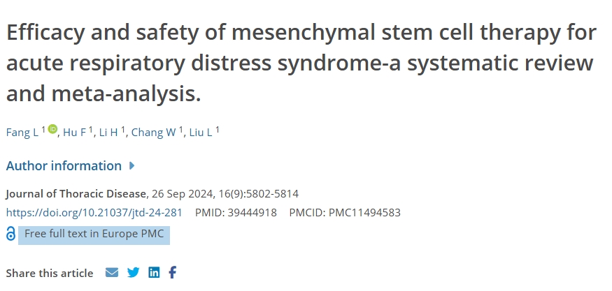 2024年9月,國際期刊雜志《胸腔疾病雜志》刊發了一篇“間充質干細胞治療急性呼吸窘迫綜合征的療效和安全性——系統評價和薈萃分析”臨床研究文獻綜述。