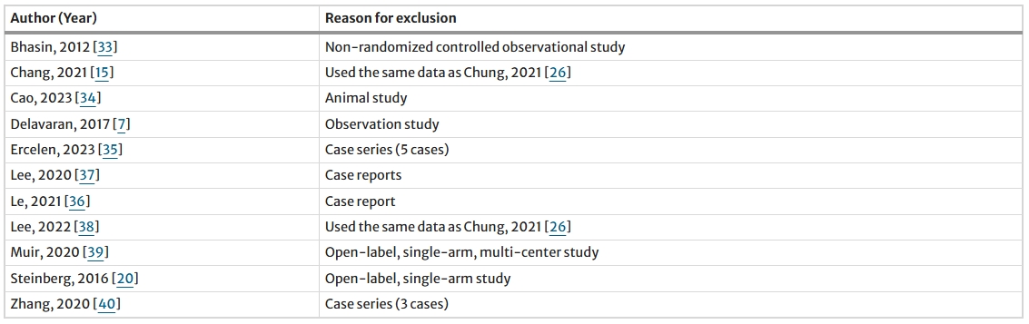 納入研究的特征和質(zhì)量評估分別詳見表2和表3。共納入190例患者,其中治療組115例,對照組75例。治療方式包括自體間充質(zhì)干細(xì)胞(n=2)和 G-CSF(n?=2)刺激以增加干細(xì)胞。綜述中納入的文章來自韓國、法國、英國和臺(tái)灣。所有研究的平均年齡為63.15歲,范圍從53歲到76歲。
