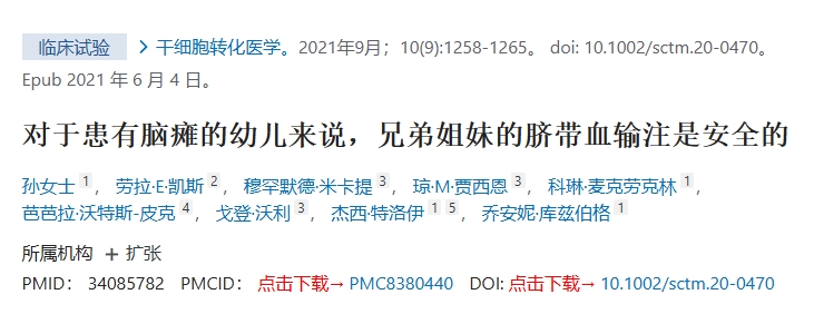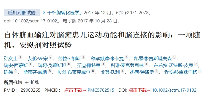 在2021年的一項研究中,孫某等向15名腦性癱瘓患兒靜脈注射了5×107個總有核細胞/kg的同胞臍帶血,報告除注射后前2周出現短暫性皮疹和發熱外,未出現明顯不良反應。據他們報告,注射后6個月,運動功能明顯改善。
