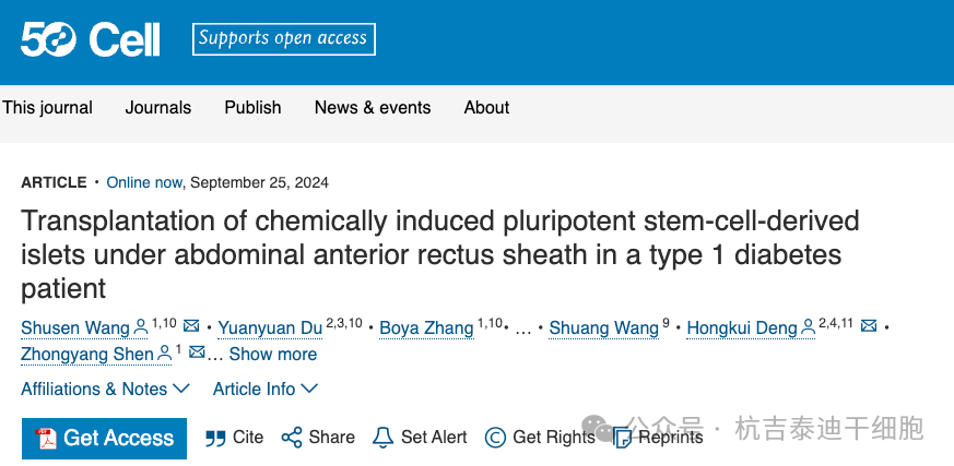 2024年9月25日,天津市第一中心醫(yī)院沈中陽(yáng)、王樹(shù)森研究組聯(lián)合北京大學(xué)昌平實(shí)驗(yàn)室鄧宏魁研究組在Cell發(fā)表題為“Transplantation of Chemically Induced Pluripotent Stem-Cell-Derived Islet Under Abdominal Anterior Rectus Sheath in a Type 1 Diabetes Patient”的研究論文,在國(guó)際上首次報(bào)道了利用化學(xué)重編程誘導(dǎo)多能干細(xì)胞制備的胰島細(xì)胞移植,治療1型糖尿病的臨床研究。