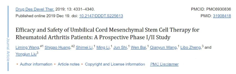 2019年,伊朗科研人員在期刊雜志《生物醫(yī)學(xué)與藥物治療學(xué)》上發(fā)表了一篇“自體骨髓間充質(zhì)干細(xì)胞治療后難治性類風(fēng)濕性關(guān)節(jié)炎患者臨床癥狀改善的臨床試”的文章。