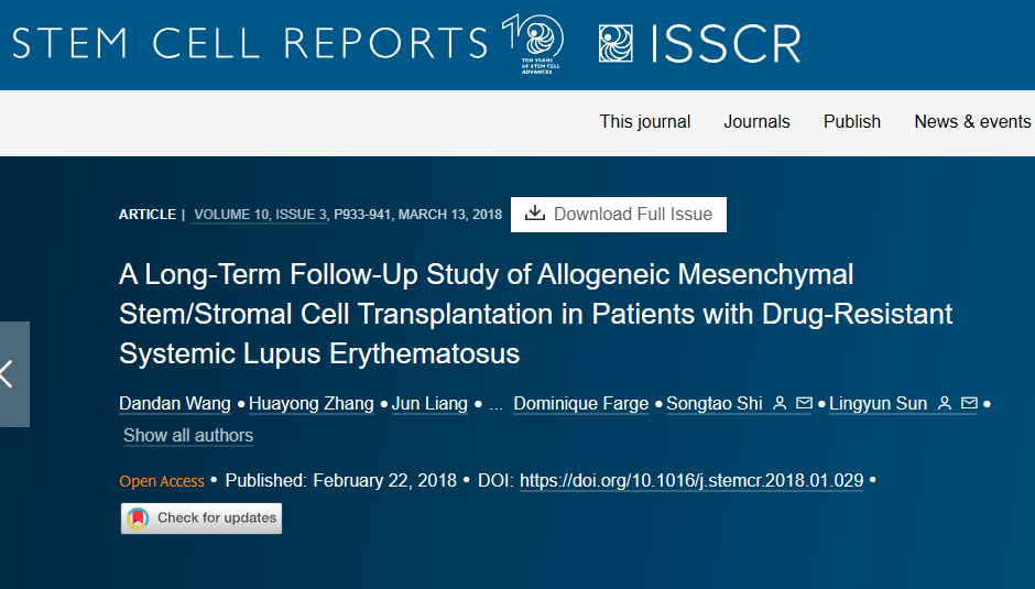 2018年,國(guó)際期刊《STEM CELL REPORTS》上刊登了關(guān)于間充質(zhì)干細(xì)胞治療系統(tǒng)性紅斑狼瘡的臨床研究。這是一項(xiàng)開(kāi)放標(biāo)簽的II期臨床試驗(yàn),81名重度難治性系統(tǒng)性紅斑狼瘡患者接受異體骨髓/臍帶間充質(zhì)干細(xì)胞靜脈輸注治療,并進(jìn)行了平均長(zhǎng)達(dá)5年的隨訪。