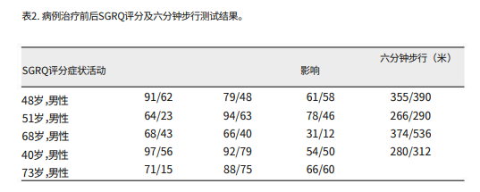 肺功能指標改善:2 例慢性阻塞性肺疾病在應用重組人粒細胞集落刺激因子動員干細胞治療 2 ~ 3 周期后 CAT 評分、圣喬治評分、COPD 綜合評分等生活質量評分及 FEV 1 、FEV 1 / pred改善程度較小。