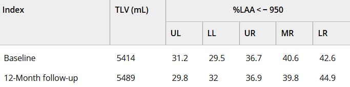 • 肺氣腫程度:通過低衰減區(LAA)百分比評估肺泡破壞改善情況。