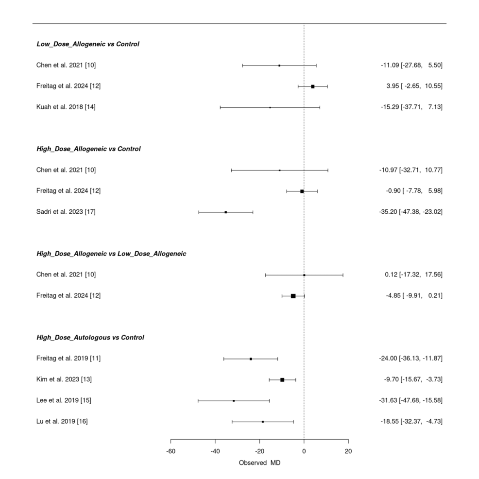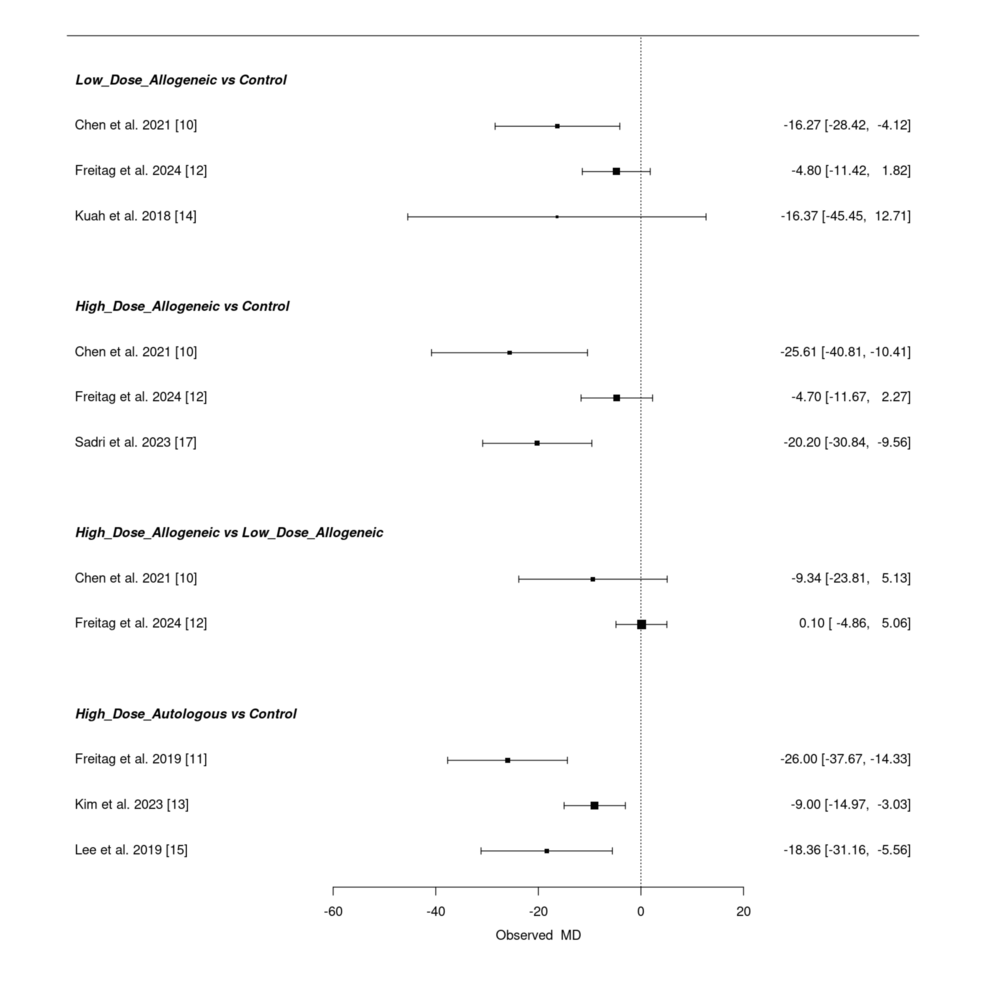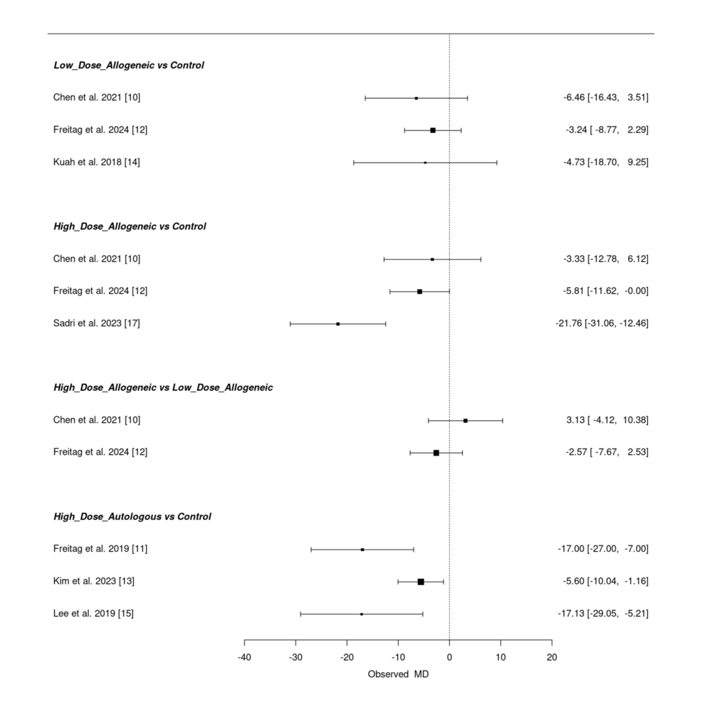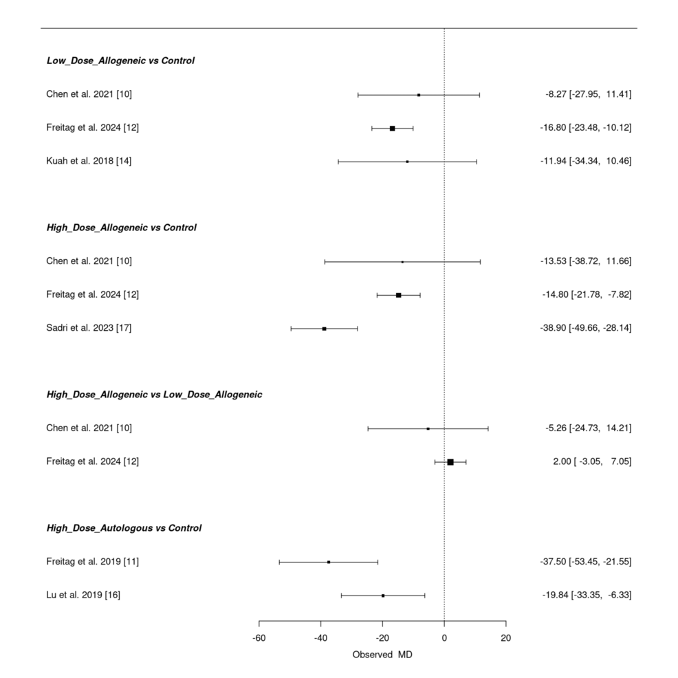低劑量異基因AD-MSCs在Chen等(2021年)和Freitag 等(2024年)研究中僅表現(xiàn)出小幅改善(MD 分別為 – 6.46 和 – 3.24),Kuah 等(2018 年)因置信區(qū)間寬泛,療效不確定性突出。高劑量異基因 AD-MSCs 在 Sadri 等(2023 年)研究中實現(xiàn)強效改善,F(xiàn)reitag 等(2024 年)也觀察到顯著但較溫和的效果(MD=-5.81),但 Chen 等(2021 年)因置信區(qū)間較寬,效果存疑。高劑量自體 AD-MSCs 在 Freitag(2019 年,MD=-17.00)和 Lee(2019 年,MD=-17.13)等研究中均顯示顯著改善,即使 Kim 等(2023 年)的中等效果(MD=-5.60)仍優(yōu)于低劑量組。高劑量與低劑量異基因組的直接比較因置信區(qū)間重疊,未顯示明確劑量優(yōu)勢。