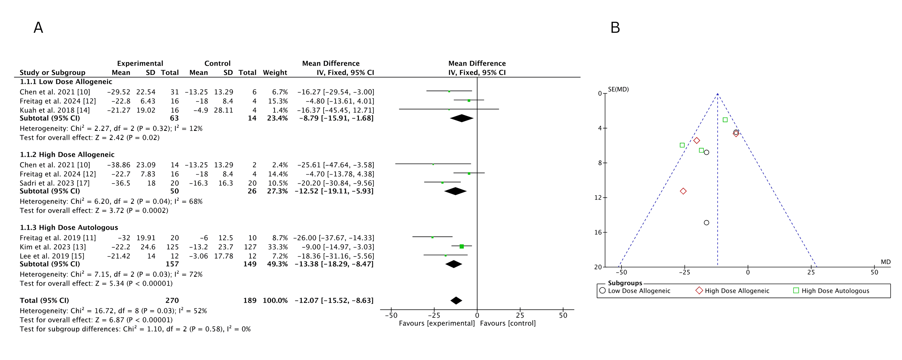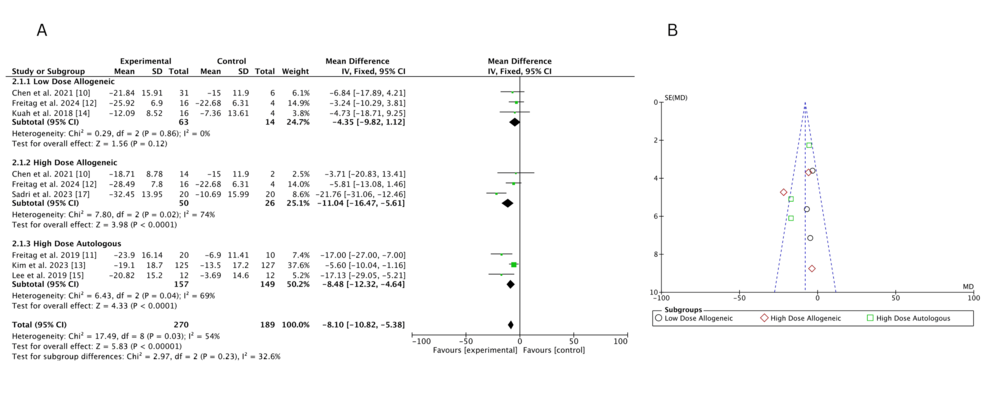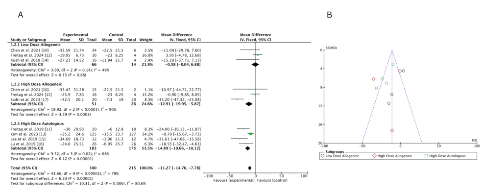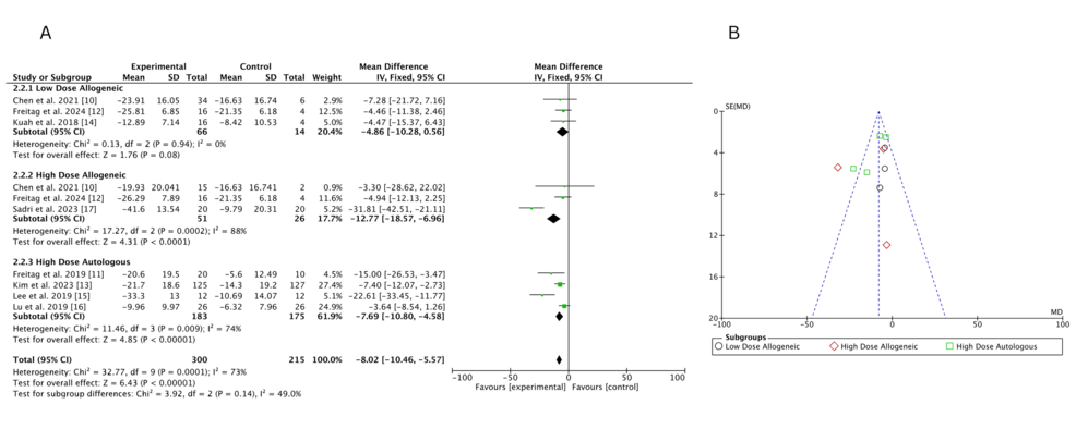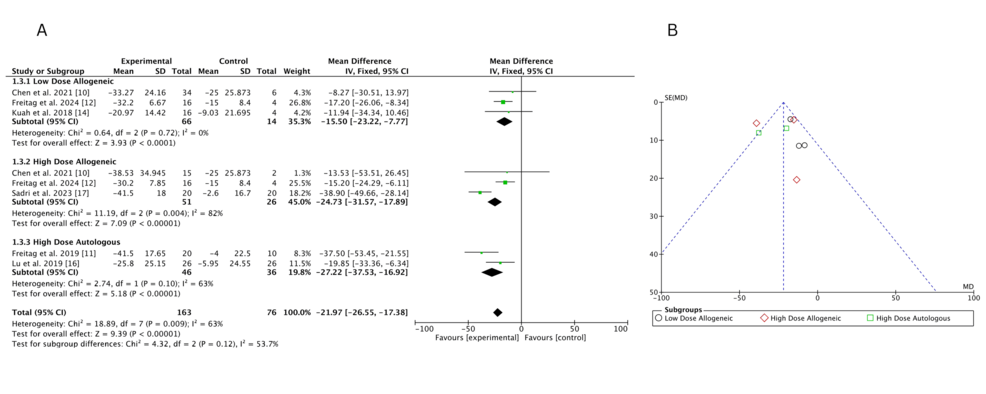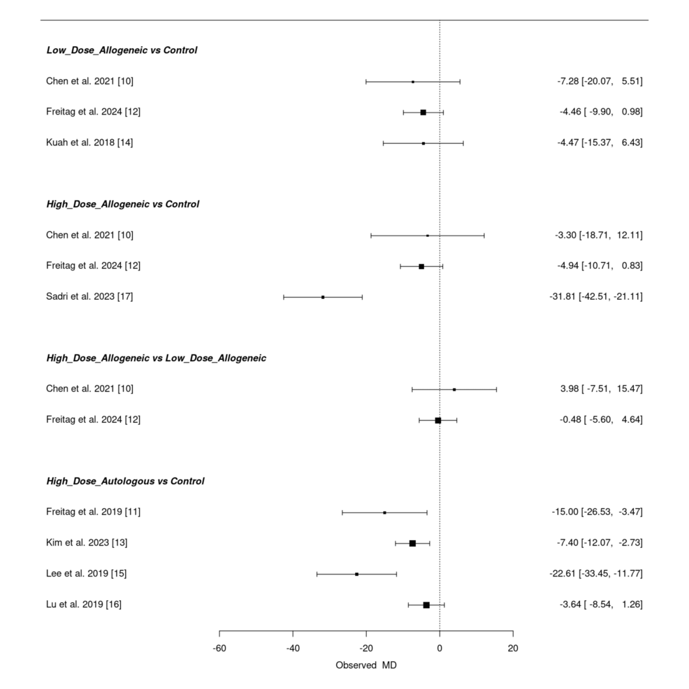 低劑量異基因AD-MSCs在Chen等(2021年)和Freitag 等(2024年)研究中僅表現(xiàn)出小幅改善(MD 分別為 – 6.46 和 – 3.24),Kuah 等(2018 年)因置信區(qū)間寬泛,療效不確定性突出。高劑量異基因 AD-MSCs 在 Sadri 等(2023 年)研究中實現(xiàn)強效改善,F(xiàn)reitag 等(2024 年)也觀察到顯著但較溫和的效果(MD=-5.81),但 Chen 等(2021 年)因置信區(qū)間較寬,效果存疑。高劑量自體 AD-MSCs 在 Freitag(2019 年,MD=-17.00)和 Lee(2019 年,MD=-17.13)等研究中均顯示顯著改善,即使 Kim 等(2023 年)的中等效果(MD=-5.60)仍優(yōu)于低劑量組。高劑量與低劑量異基因組的直接比較因置信區(qū)間重疊,未顯示明確劑量優(yōu)勢。