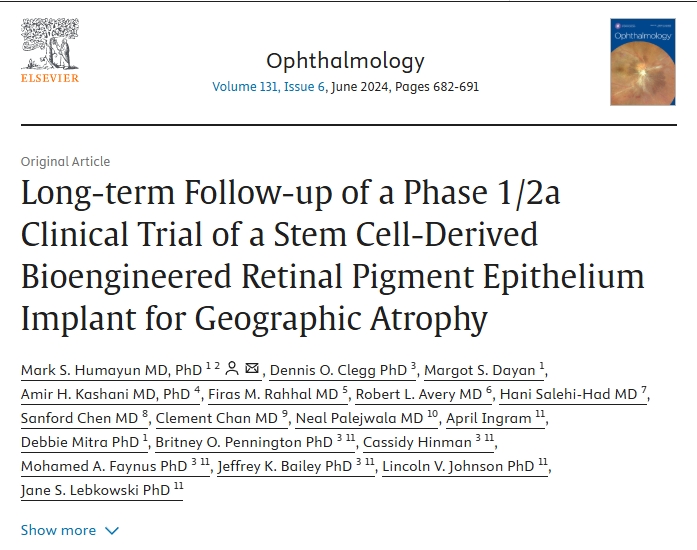 2024年,一項“干細胞衍生的生物工程視網膜色素上皮植入物治療地圖狀萎縮的1/2a期臨床試驗的長期隨訪”試驗報告顯示,基于支架的hESC衍生的RPE植入物是安全的,并且在中位三年的隨訪中顯示出良好的視力改善效果。