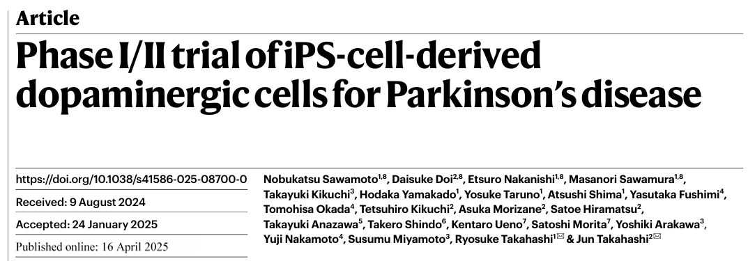 日本京都大學團隊利用誘導多能干細胞(iPSC)分化的多巴胺能前體細胞進行移植治療,7名患者在24個月隨訪中未出現嚴重副作用,且運動功能評分(MDS-UPDRS)顯著改善,氟-18-DOPA顯像顯示多巴胺合成能力提升44.7%。