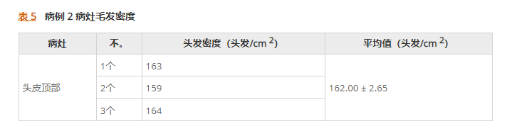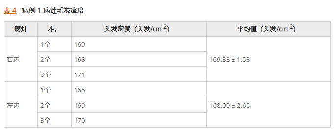 治療四年后,患者在先前AA損傷部位的平均毛發(fā)密度為169.33根頭發(fā)/cm2(右側(cè)損傷)和 168.00 根頭發(fā)/cm2(左側(cè)損傷)(表4)。