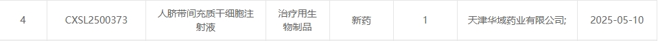 新增受理11:2025年05月10號,天津華域藥業有限公司的“人臍帶間充質干細胞注射液”的臨床試驗申請獲受理(受理號:CXSL2500373)。這是該款細胞注射液第1次獲得受理。
