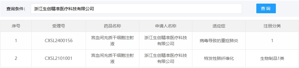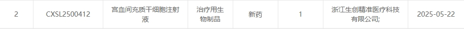 新增受理13:2025年05月22號,浙江生創精準醫療科技有限公司的“宮血間充質干細胞注射液”的臨床試驗申請獲受理(受理號:CXSL2500412)。這是該款細胞注射液第3次獲得受理。