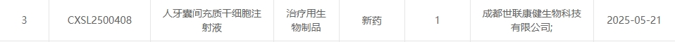 新增受理12:2025年05月21號,成都世聯康健生物科技有限公司的“人牙囊間充質干細胞注射液”的臨床試驗申請獲受理(受理號:CXSL2500408)。這是該款細胞注射液第1次獲得受理。