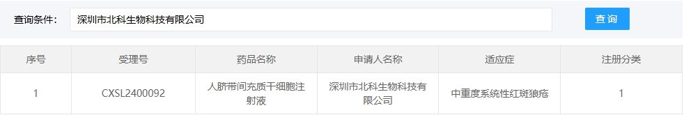 新增受理10:2025年05月01號,深圳市北科生物科技有限公司的“人臍帶間充質干細胞注射液”的臨床試驗申請獲受理(受理號:CXSL2400092)。這是該款細胞注射液第1次獲得受理。適應癥:中重度系統性紅斑狼瘡。