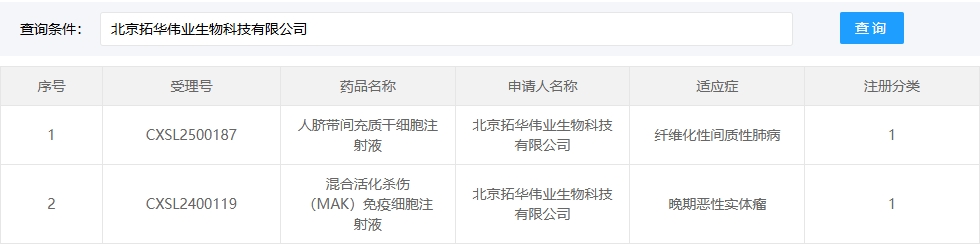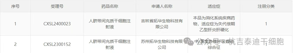 新增受理7:2025年02月28號,北京拓華偉業生物科技有限公司的“人臍帶間充質干細胞注射液”的臨床試驗申請獲受理(受理號:CXSL2500187)。適應癥:纖維化性間質性肺病。
