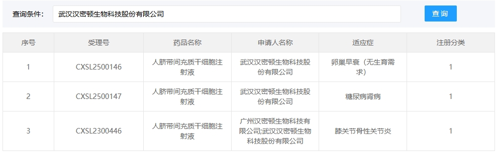 新增受理5:2025年02月15號,武漢漢密頓生物科技股份有限公司的“人臍帶間充質干細胞注射液”的臨床試驗申請獲受理(受理號:CXSL2500146)。適應癥:卵巢早衰(無生育需求)。