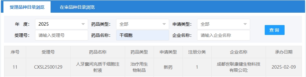 新增受理4:2025年02月09號,成都世聯康健生物科技有限公司的“人牙囊間充質干細胞注射液”的臨床試驗申請獲受理(受理號:CXSL2500129)。這是該款細胞注射液第2次獲得受理。