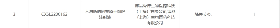 新增受理2:2025年1月25日,博品骨德(深圳)生物醫藥科技有限公司;博品(上海)生物醫藥科技有限公司的“人源脂肪間充質干細胞注射液”的臨床試驗申請獲受理(受理號:CXSL2200162),這是該款細胞注射液第1次獲得受理,適應癥:膝關節炎。