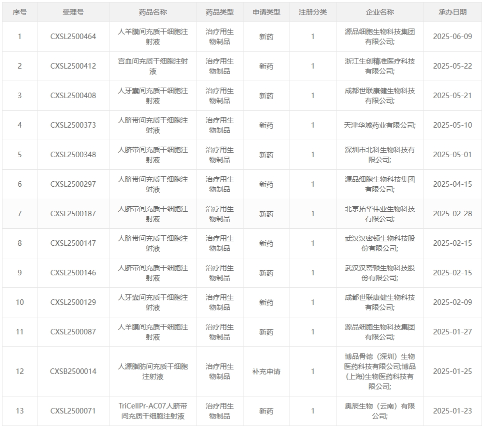 僅2025年1-5月,藥監局便受理了13項干細胞藥物臨床試驗申請,其中12項為間充質干細胞新藥,1項為造血干細胞新藥,平均每月近3項的受理速度凸顯行業創新活力。