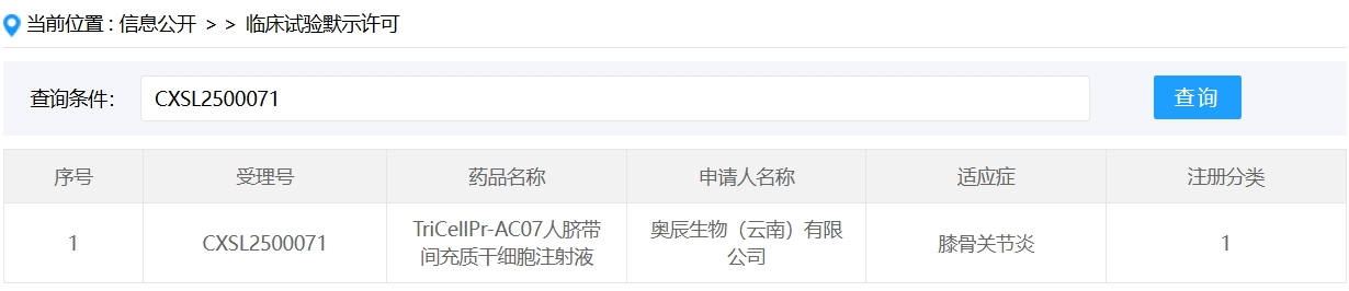 新增受理1:2025年1月23日,奧辰生物(云南)有限公司申報的 “TriCellPr-AC07人臍帶間充質干細胞注射液” 臨床試驗申請首次獲受理(受理號:CXSL2500071),適應癥:膝骨關節炎。