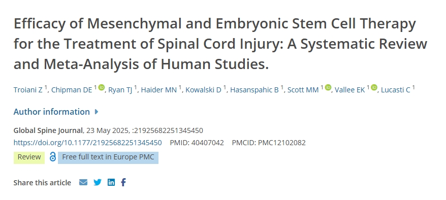[1]Troiani Z, Chipman DE, Ryan TJ, et al. Efficacy of Mesenchymal and Embryonic Stem Cell Therapy for the Treatment of Spinal Cord Injury: A Systematic Review and Meta-Analysis of Human Studies. Global Spine Journal. 2025 May:21925682251345450. DOI: 10.1177/21925682251345450. PMID: 40407042; PMCID: PMC12102082.