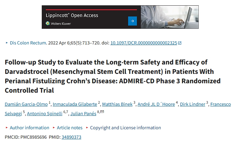 2022年,Garcia-Olmo等人的ADMIRE-CD研究評估了另一種AASC產品 darvadstrocel 治療克羅恩病復雜性肛瘺在104周內的長期有效性和安全性。該報告描述了初始52周研究后的延長隨訪階段,共有40名完成52周隨訪的患者參與(25名接受darvadstrocel治療,15名接受安慰劑治療)。darvadstrocel組患者更年輕(平均38.6歲vs42.7歲),且出現更復雜瘺管(多個開口)的比例更高(60%vs33%)。