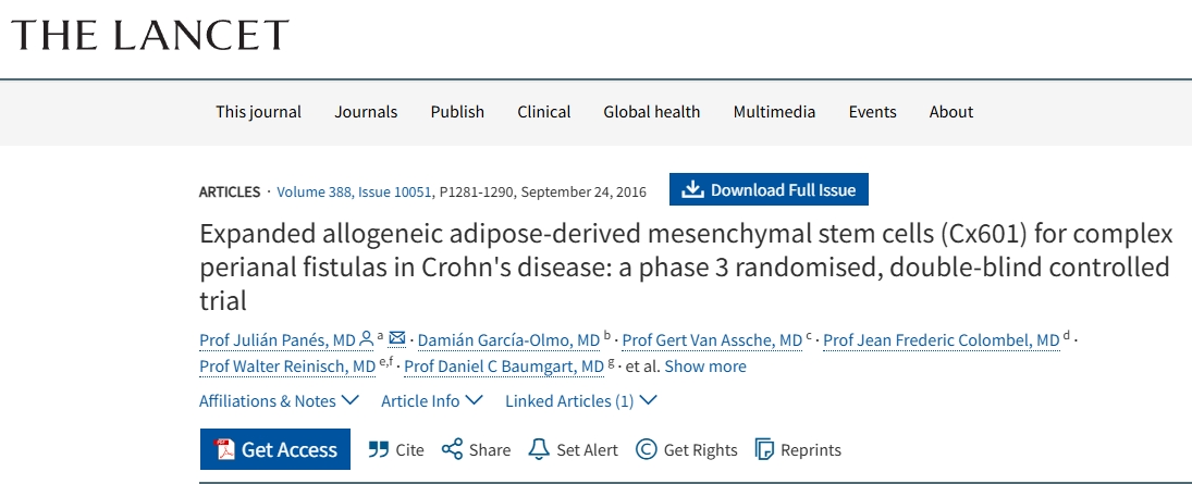 安全性結果 (Panés等: 在安全性方面,Cx601組(103例可評估)治療相關不良事件發生率(17%)低于安慰劑組(29%)。最常見的不良事件是肛門膿腫(Cx601組6例vs安慰劑組9例)和直腸痛(5例vs9例)。研究結論認為Cx601是治療對常規或生物療法無效的克羅恩病復雜肛周瘺管的一種有效且安全的療法。