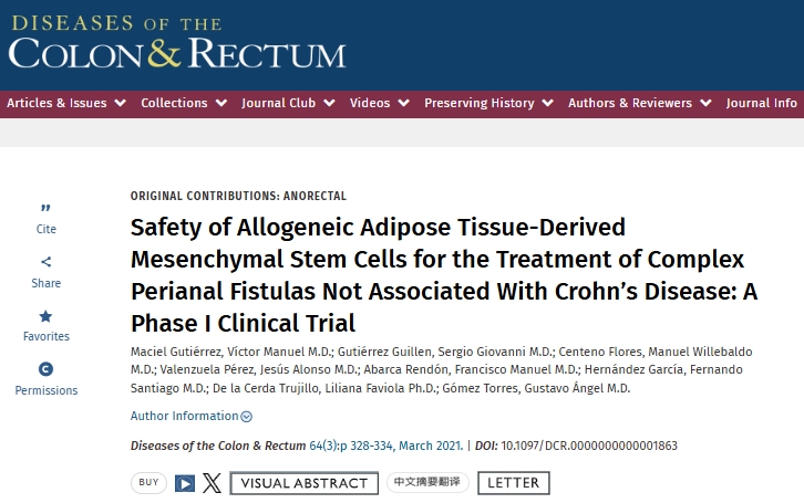 2021年,Maciel等人進行了一項“同種異體脂肪組織來源的間充質干細胞治療與克羅恩病無關的復雜性肛周瘺的安全性:I期臨床試驗的研究”,旨在評估同種異體間充質干細胞 (MSC) 治療非克羅恩病患者的復雜性肛瘺的安全性。