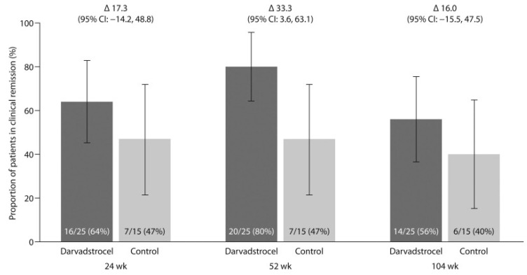主要終點與結果 (Panés等): 研究的主要終點是第24周時的綜合緩解(定義為臨床評估所有治療過的引流瘺管外部開口閉合,且經設盲的中央MRI評估確認治療瘺管內無>2厘米的積液)。在意向治療(ITT)人群中,Cx601組(107例患者)的綜合緩解率顯著高于安慰劑組(105例患者),分別為50%(53/107)和34%(36/105),絕對差異為15.2%(97.5% CI 0.2-30.3; p=0.024)。
