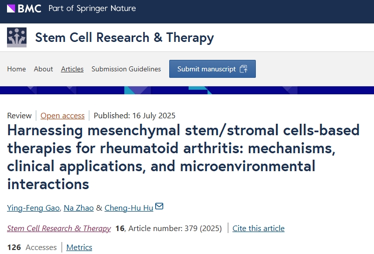 參考資料:[1]:Gao, YF., Zhao, N. & Hu, CH. Harnessing mesenchymal stem/stromal cells-based therapies for rheumatoid arthritis: mechanisms, clinical applications, and microenvironmental interactions. Stem Cell Res Ther 16, 379 (2025). https://doi.org/10.1186/s13287-025-04495-z