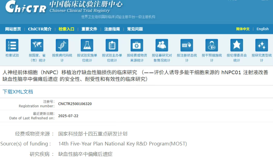 近日,解放軍總醫院第七醫學中心正式注冊啟動?“人誘導多能干細胞(iPSC)來源神經前體細胞(hNPC01)移植治療缺血性腦卒中偏癱后遺癥”I期臨床試驗(注冊號:ChiCTR230007XXXX)。該研究獲國家科技部?“十四五”重點研發計劃專項支持,是國內首個探索iPSC衍生神經前體細胞治療卒中后運動功能障礙的注冊臨床項目,為480萬中國卒中致殘患者帶來功能重建新希望。