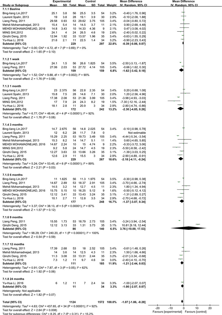 MELD評(píng)分主要用于評(píng)估終末期肝病的預(yù)后。我們觀察到干細(xì)胞治療組和對(duì)照組的MELD評(píng)分均有所下降。干細(xì)胞治療組和對(duì)照組之間存在顯著差異 (p =0.008)(圖6)。此外,盡管進(jìn)行了亞組分析,但這些研究的異質(zhì)性很高 (I 2 : 62–100%)。但這也可以僅通過(guò)一兩項(xiàng)研究來(lái)解釋。