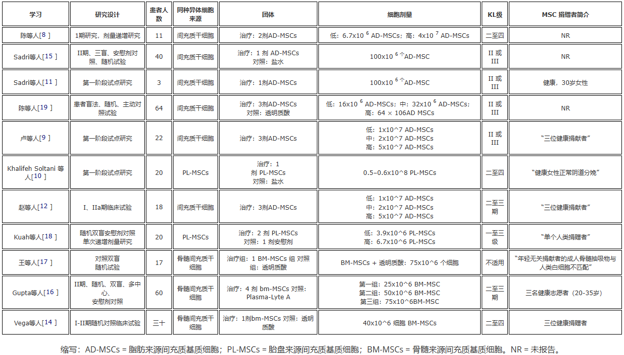 二、研究概述:11項(xiàng)試驗(yàn)揭示注射間充質(zhì)干細(xì)胞治療膝骨關(guān)節(jié)炎的潛力