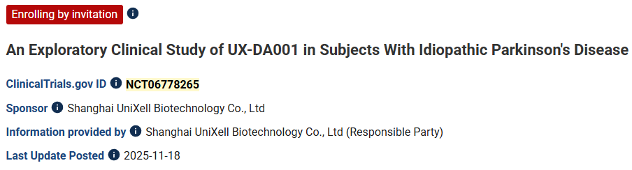 在2025年10月5日至9日于美國夏威夷檀香山舉行的國際帕金森病和運動障礙大會(MDS 2025)的“最新突破”報告環節,該項I期試驗首例患者接受UX-DA001后6個月的積極數據正式公布。