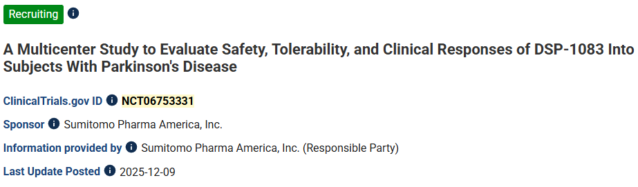 13、標題:一項評估DSP-1083在帕金森病患者中安全性、耐受性和臨床反應的多中心研究