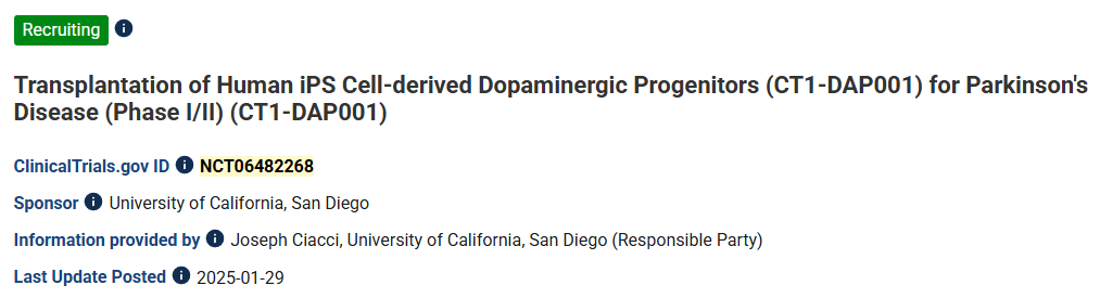 12、標題:移植人類iPS細胞衍生的多巴胺能祖細胞(CT1-DAP001)治療帕金森?。↖/II期)