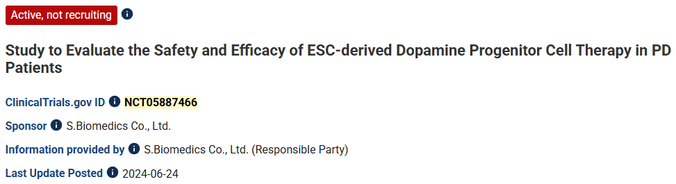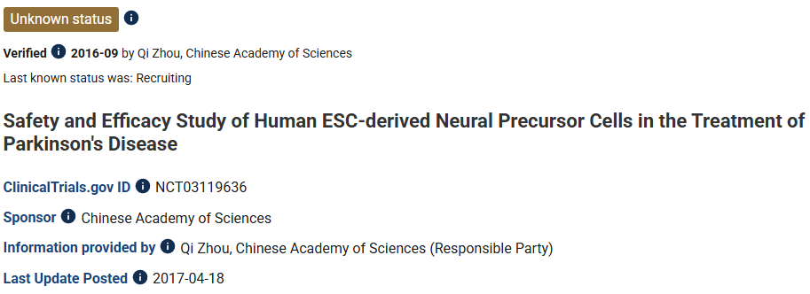 備注:這是首個嘗試將干細胞衍生的多巴胺能移植應用于帕金森病患者的臨床試驗。目前尚未公布臨床數據。