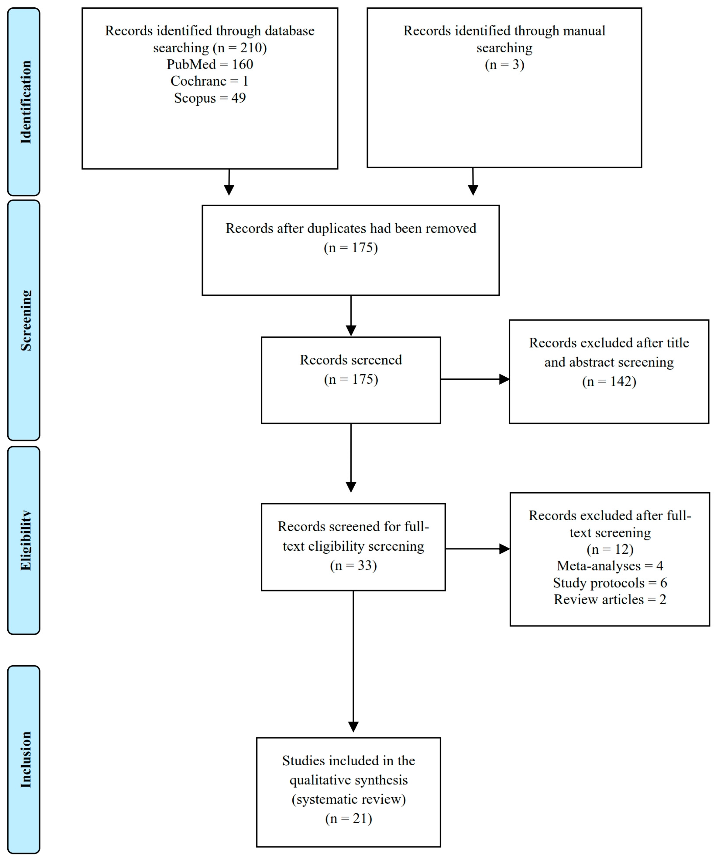 結果:總共確定并篩選了175項研究。其中,對33項進行了資格評估,將21項(11項PubMed研究、7項Scopus研究和3項Google Scholar研究)納入薈萃分析。